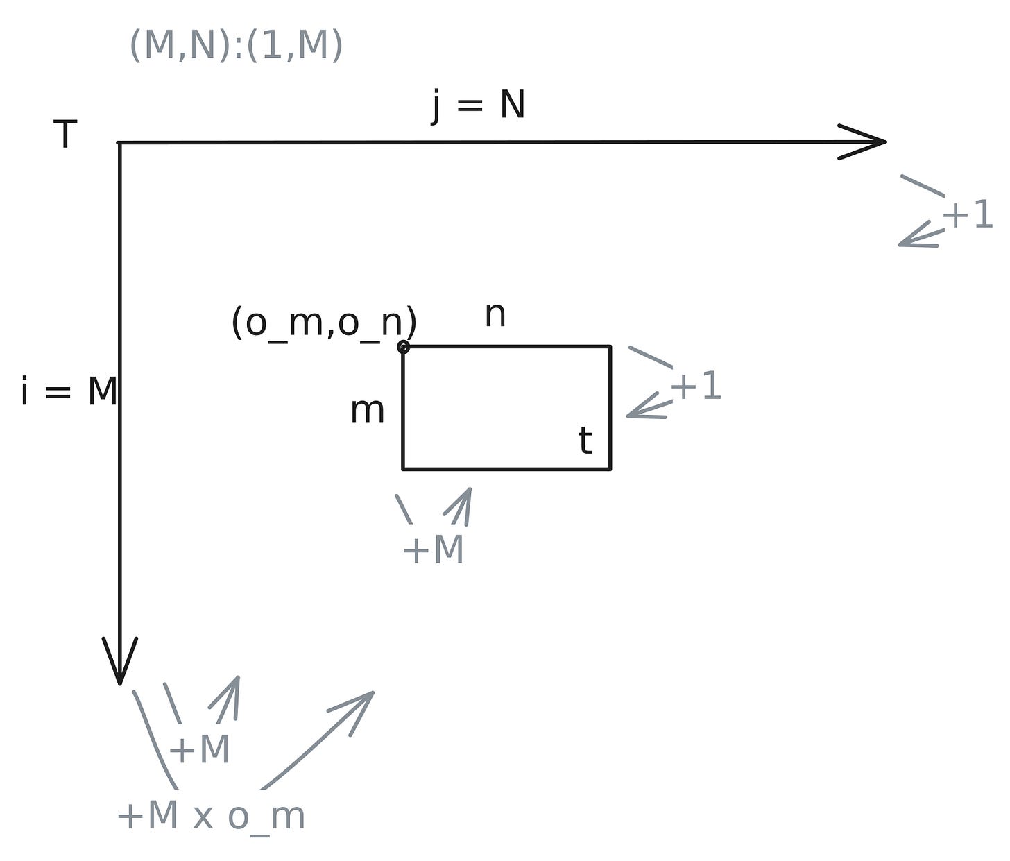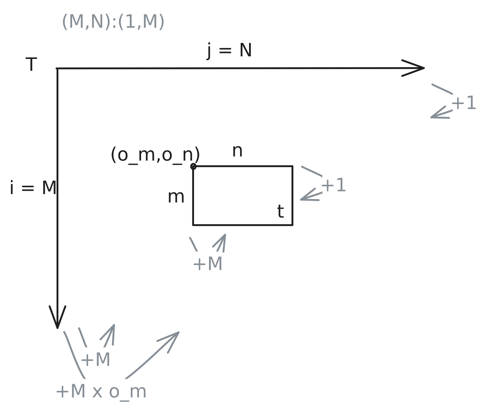 We can observe, that the tensor of the smaller tile has the same striding pattern but just different shapes and starting pointer (the offset (om,on) which is offset om+on×M) Layout(T)=(M,N):(1,M) and Layout(t)=(m,n):(1,M).
